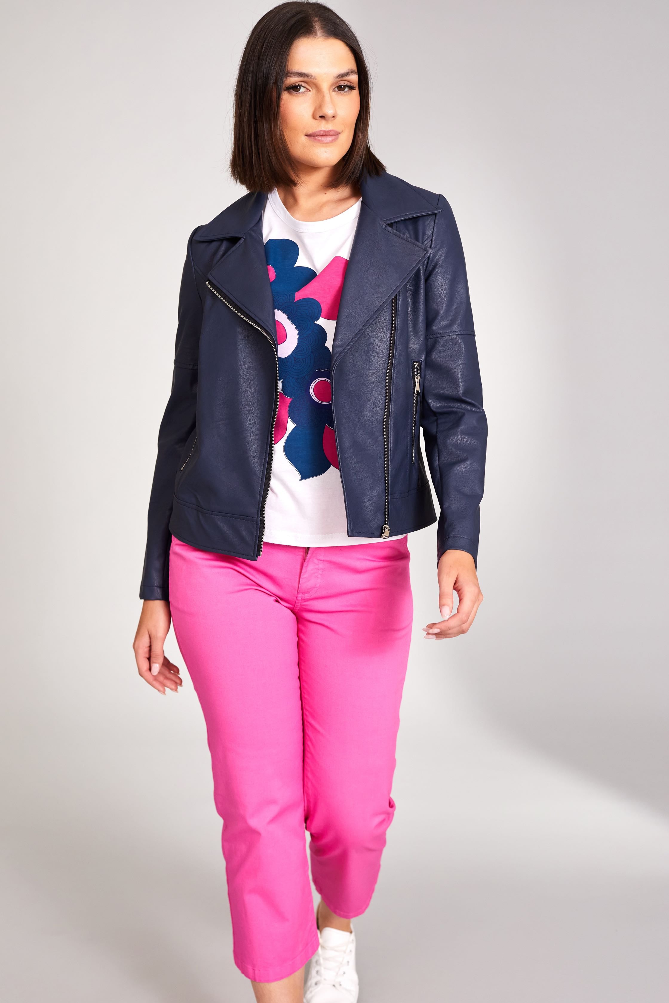 This PU jacket by Peruzzi has an off centre zip fastening with side zip pockets.