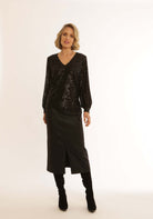 This sequinned top by Pomodoro has a v neckline and elasticated cuffs , fully lined.