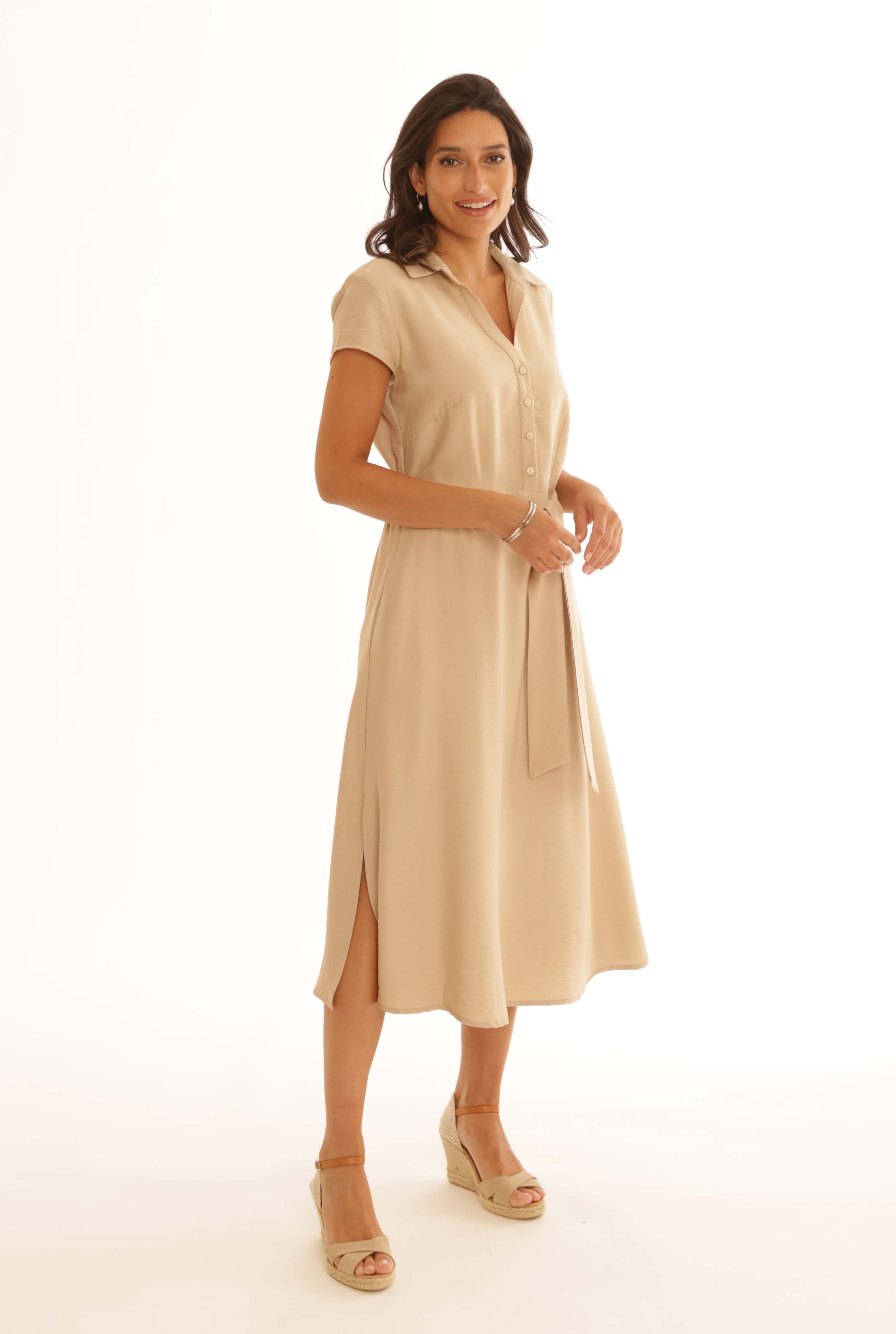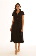 This solid fit and flare style dress by Pomodoro has a button placket to bodice and side splits to skirt. Tie belt at the waist