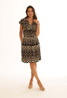 This easy fitting dress by Pomodoro has a cap sleeve , drawstring tie belt and side seam pockets