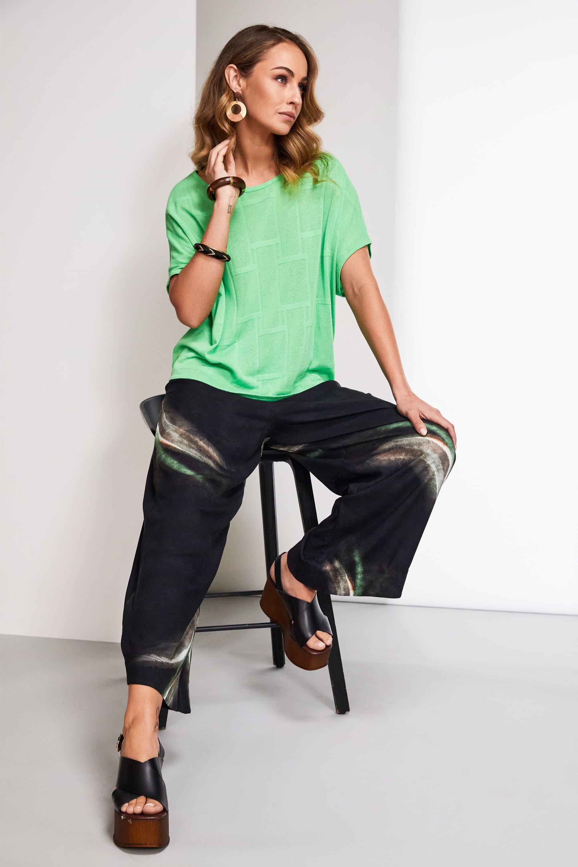 These wide leg trousers by Naya is this striking brush stroke print have an easy fitting waist and side pockets. They feel and look like silk.