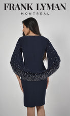 The Shoulder drape which is enhanced with beading creates a sleeve then falls to the back of the dress .