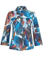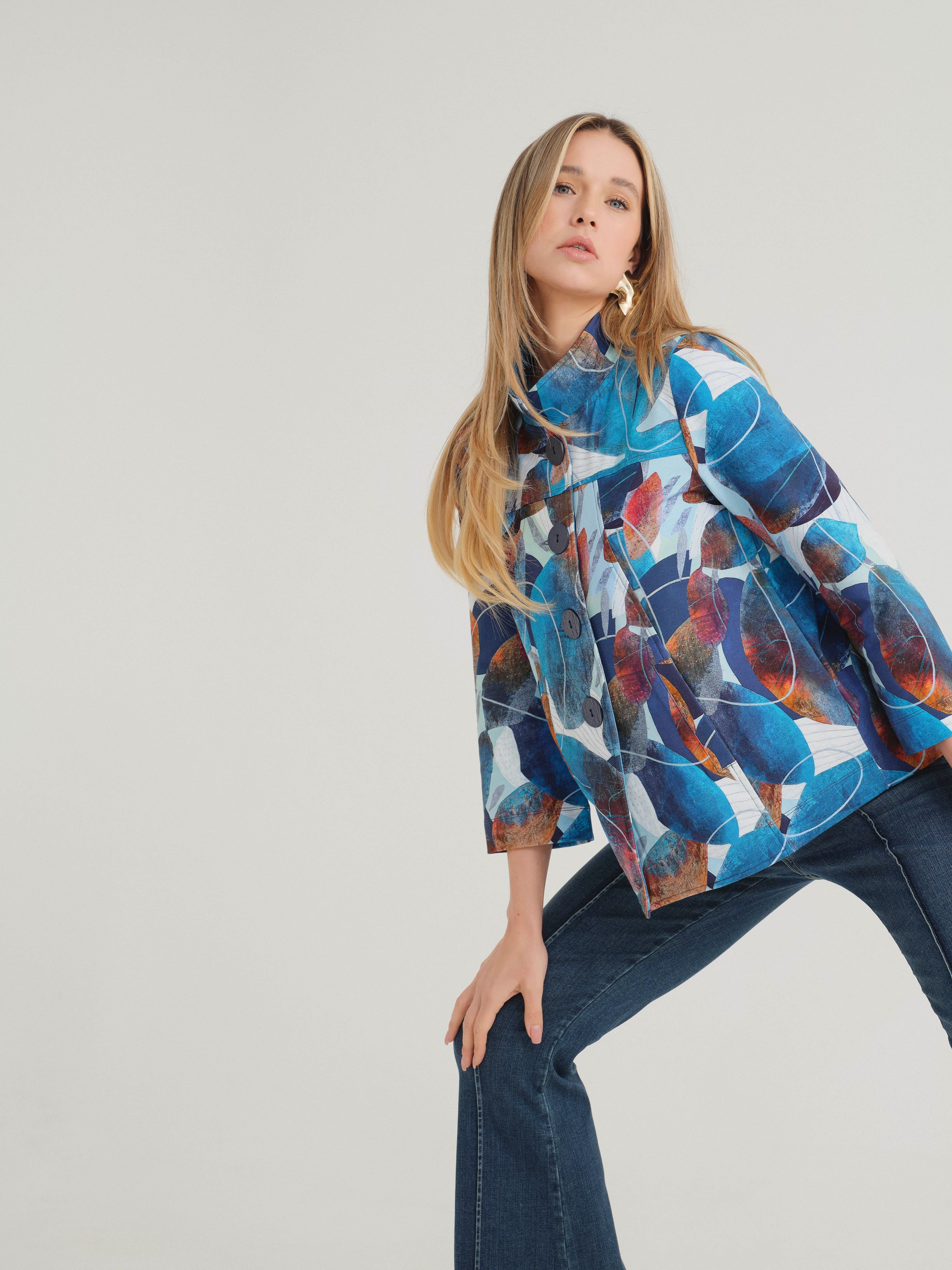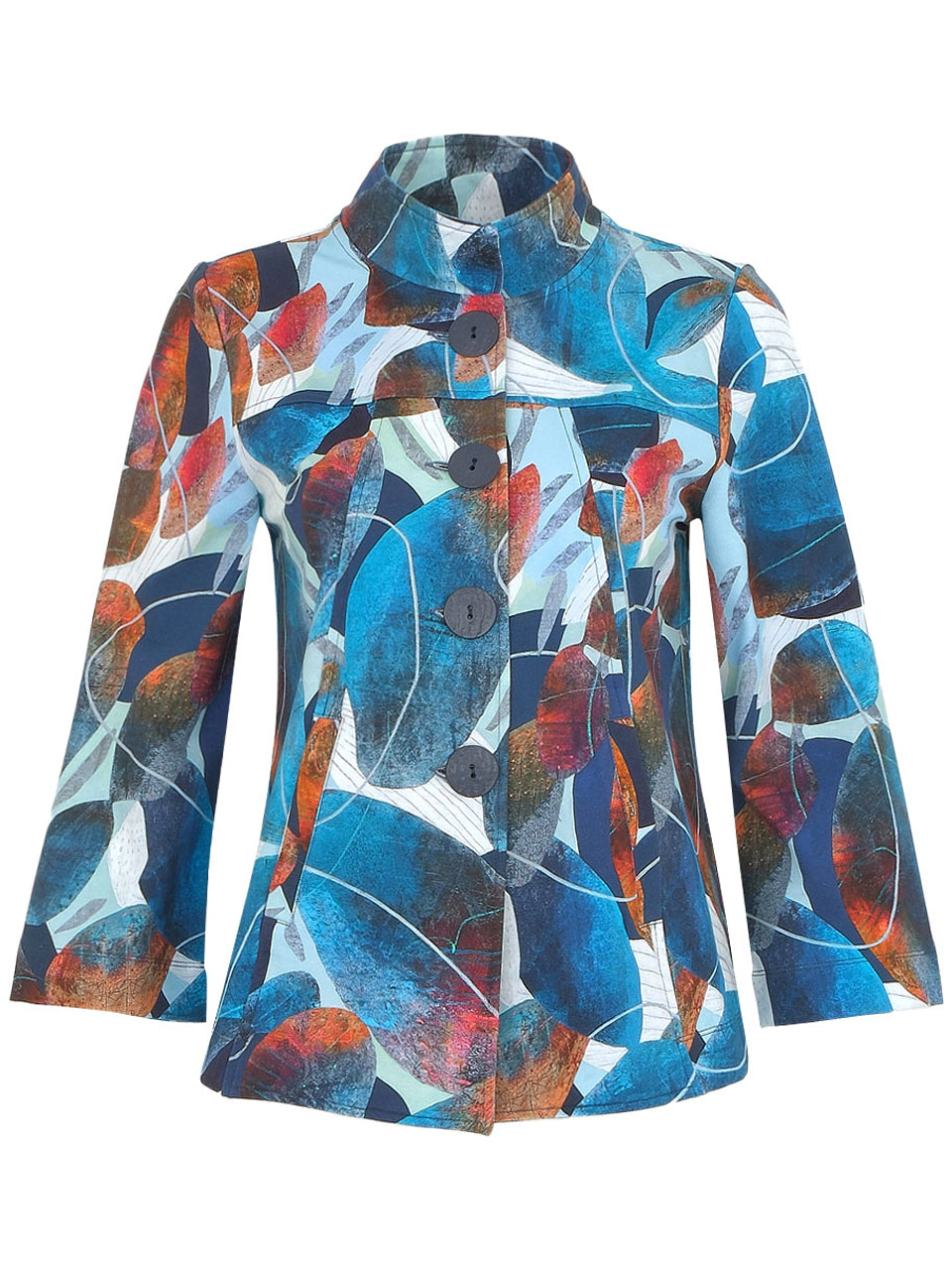 This smart /casual jacket by Dolcezza in a abstract print has an optional mandarin collar with large button fastening and inset pockets to front