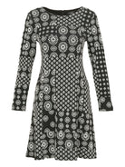 This patterned dress by Dlocezza in a fit and flare style has a round neckline and long sleeves