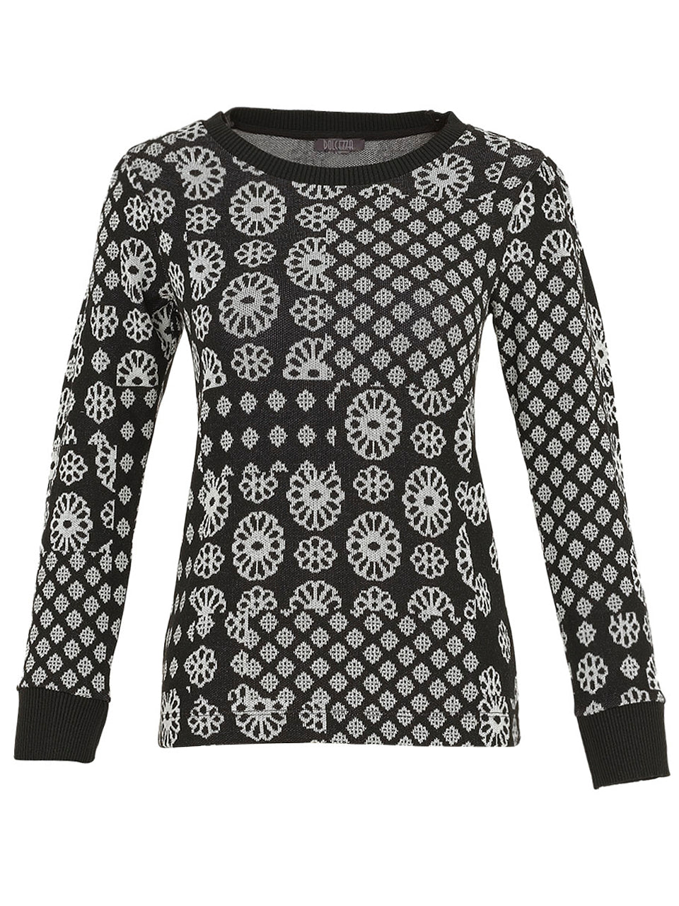 This block design print top by Docezza a round neckline which has a self coloured ribbing which also highlights the cuffs