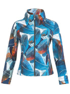 This smart / casual jacket by Dolcezza in a blue abstract print has an optional funnel neckline which can be worn as a collar , and has a full zip fastening