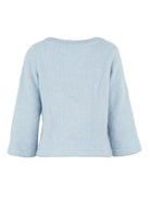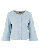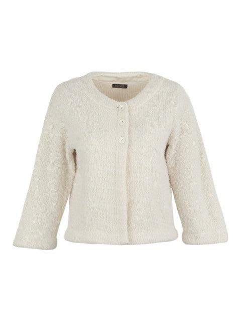 This boucle knit cardigan with a fine metallic thread has a round neckline with a triple button fastening