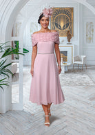 This beautiful dress  by Veromia has a rosette encrusted shawl collared Bardot neckline with a fitted bodice and a double layered voile skirt. With diamanté detail to the waistline