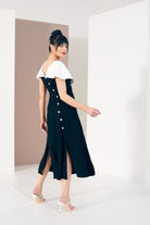 The contrasting Ivory shawl collar is highlighted with the oblique button detail to the back of the dress leading to the hemline splits.