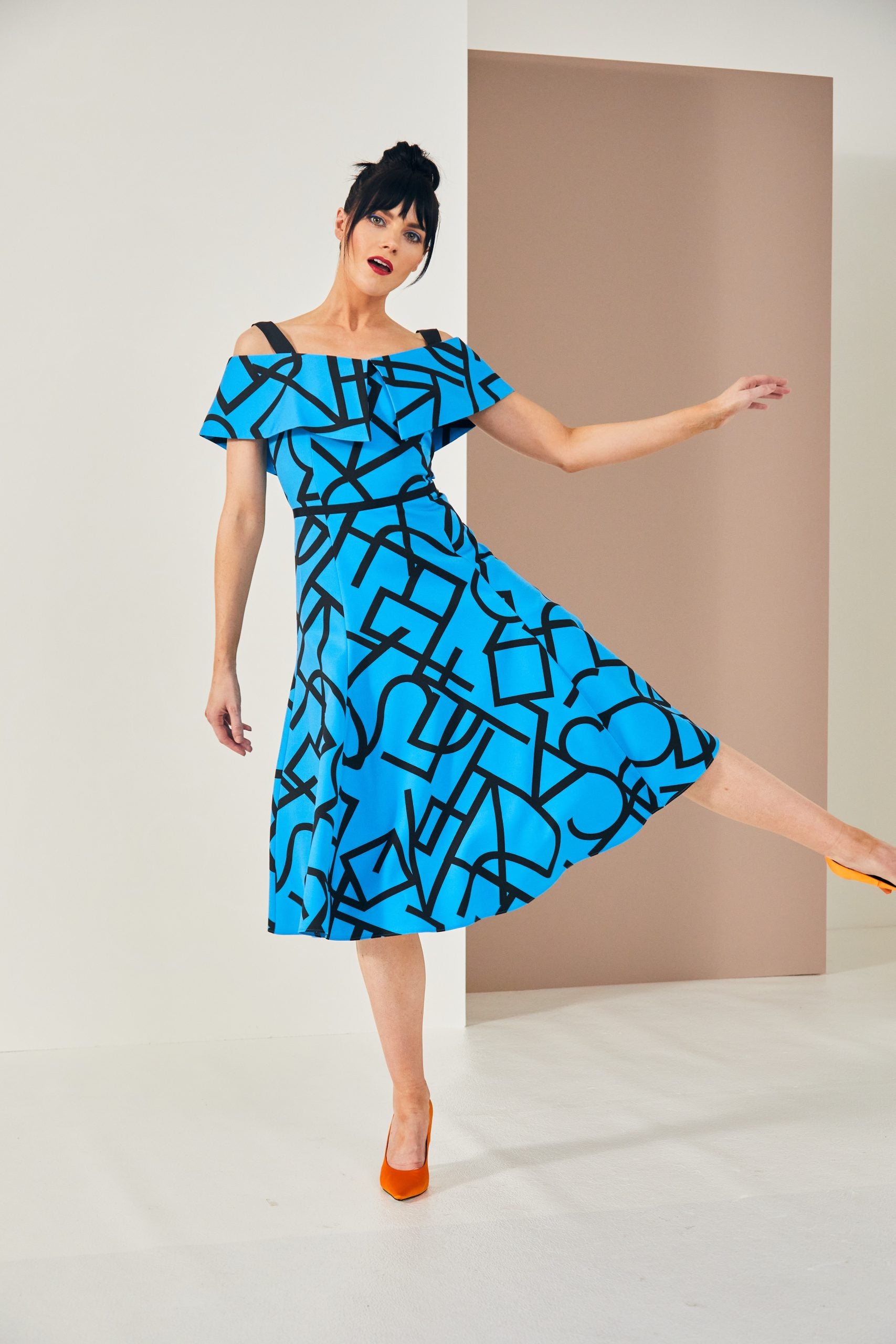 This dress by Kate Cooper has a bordo neckline with shoulder straps the fold collar detail creating a sleeve. It has a fitted bodice and a full skirt.