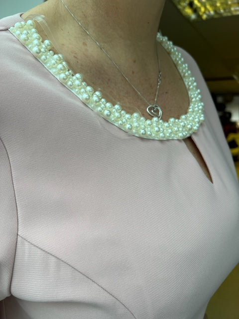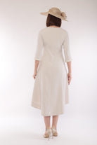 This classic dress by Lizabella in a fit and flare style has a keyhole detail to neckline which is enhanced with bead detail , this is also a feature on the bracelet length sleeves. The fishtail hemline creates a beautiful swish to the skirt.