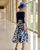 A Beautiful dress by Rosa Clara which has a self coloured crossover bodice with elbow length sleeves. The floaty triple layered print full skirt has a ruched gathered belt with large rosette detail.