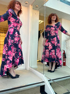Semi Bardot neckline dress by Veromia in a beautiful print. This  shawl collared dress has bracelet length sleeves and diamanté detail to waistline. The swing skirt has a fishtail hemline.