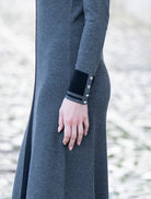 This soft knitted fit and flare style dress has a contrasting panelling to centre front and cuffs also edging to the armhole