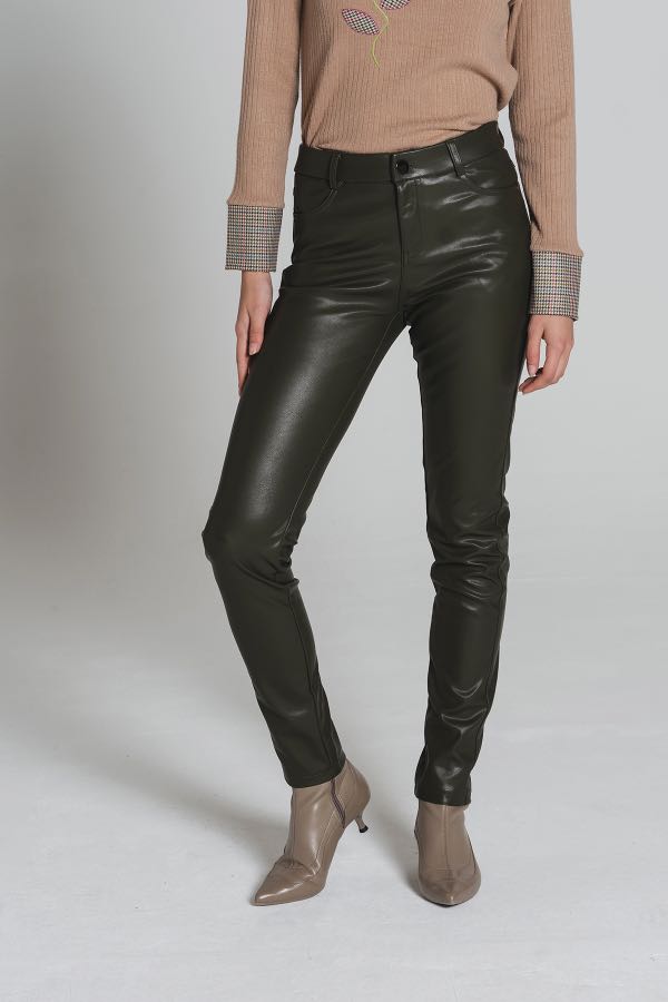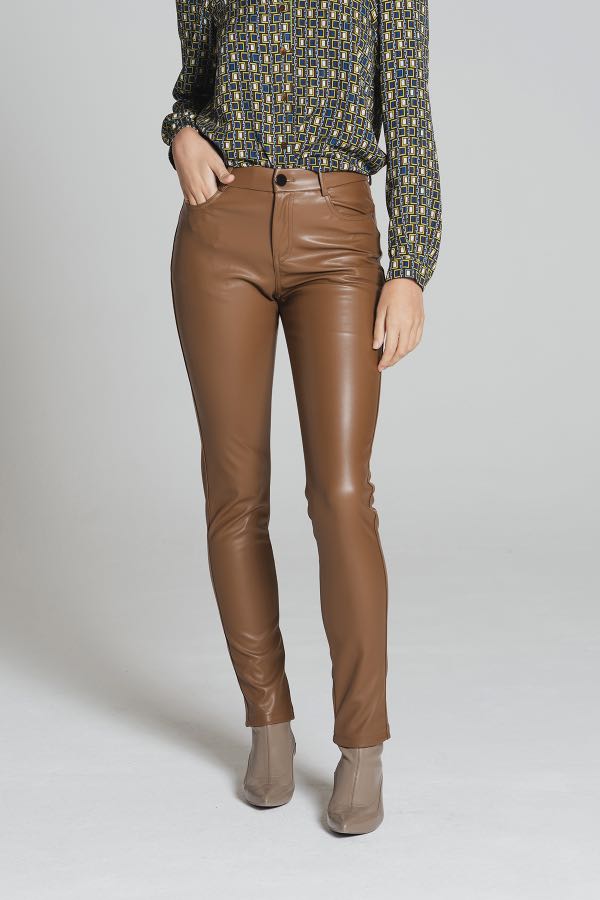 Faux Leather look trousers by Bariloche. With fitted waistband and hips pockets.