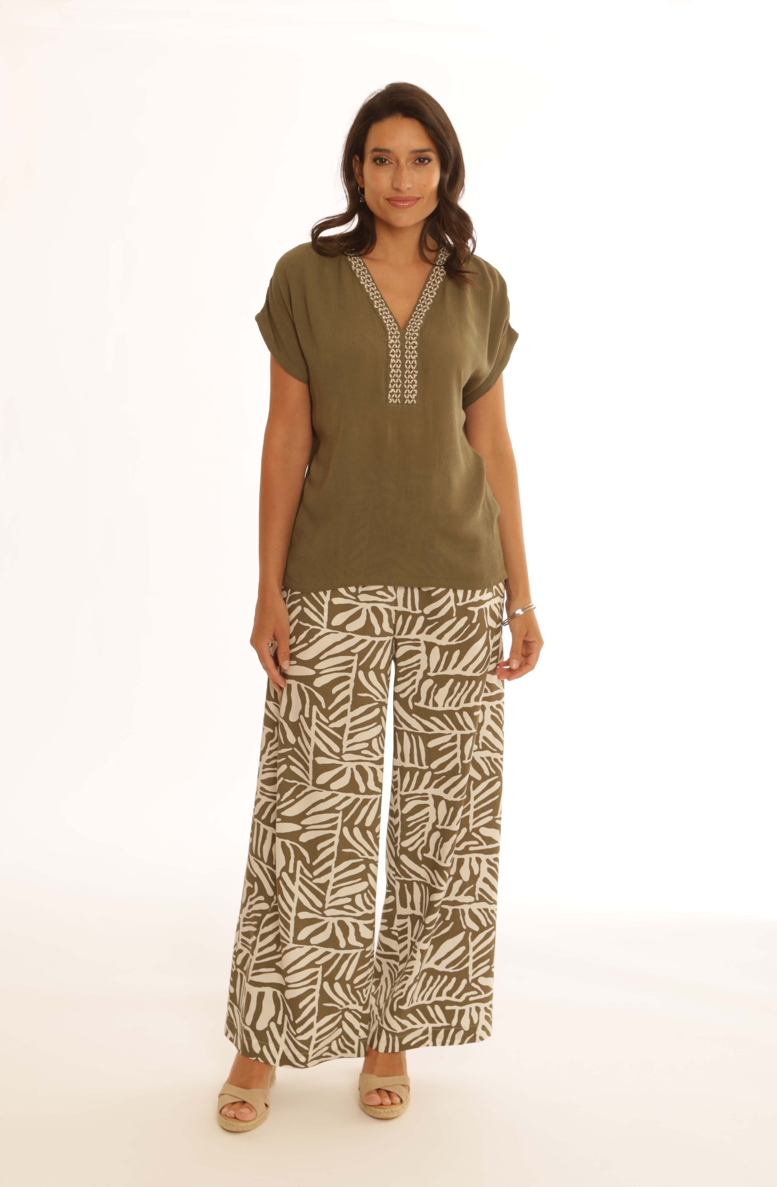 This top by Pomodoro has a drop sleeve and a v neckline with a criss cross detail