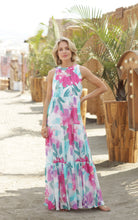 A colourful summer dress by Pomodoro with a round neckline and tiered full length skirt