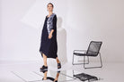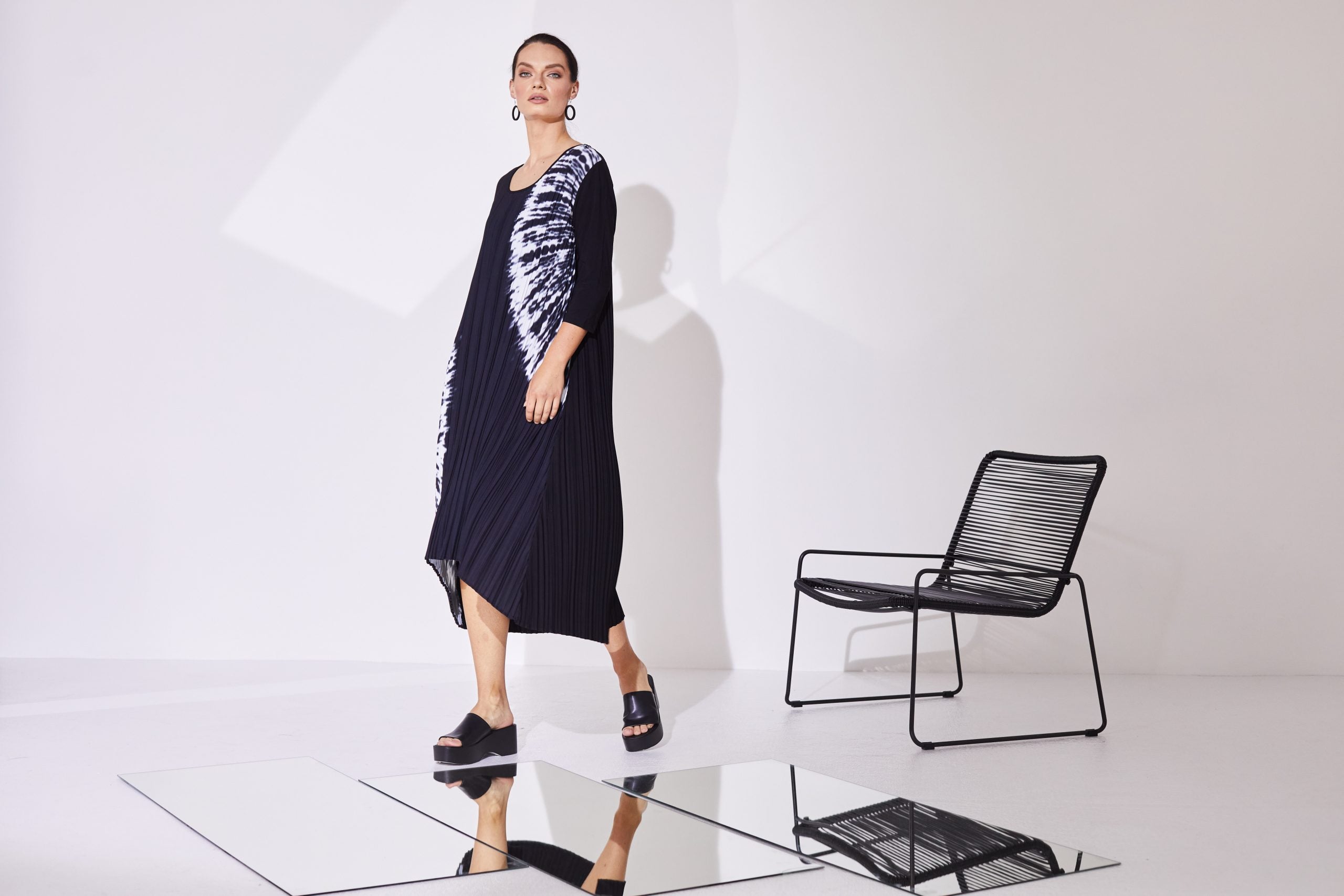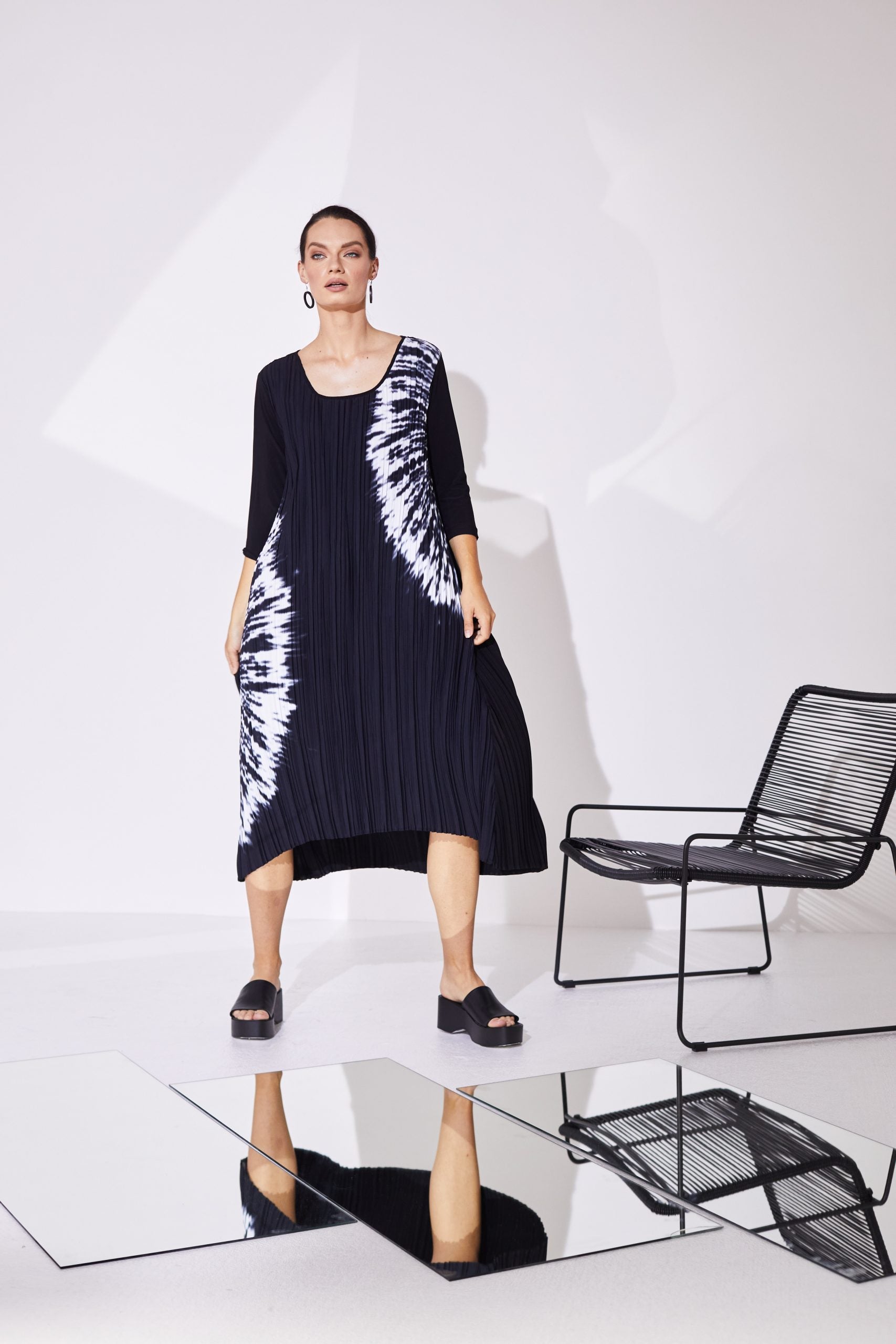 This pleated dress by Naya has a deep scoop neckline and elbow length sleeves with a sunburst design in contrasting colour