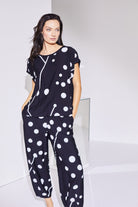 This spotted top by Naya with round neckline and cap sleeve has a button detail to back panel