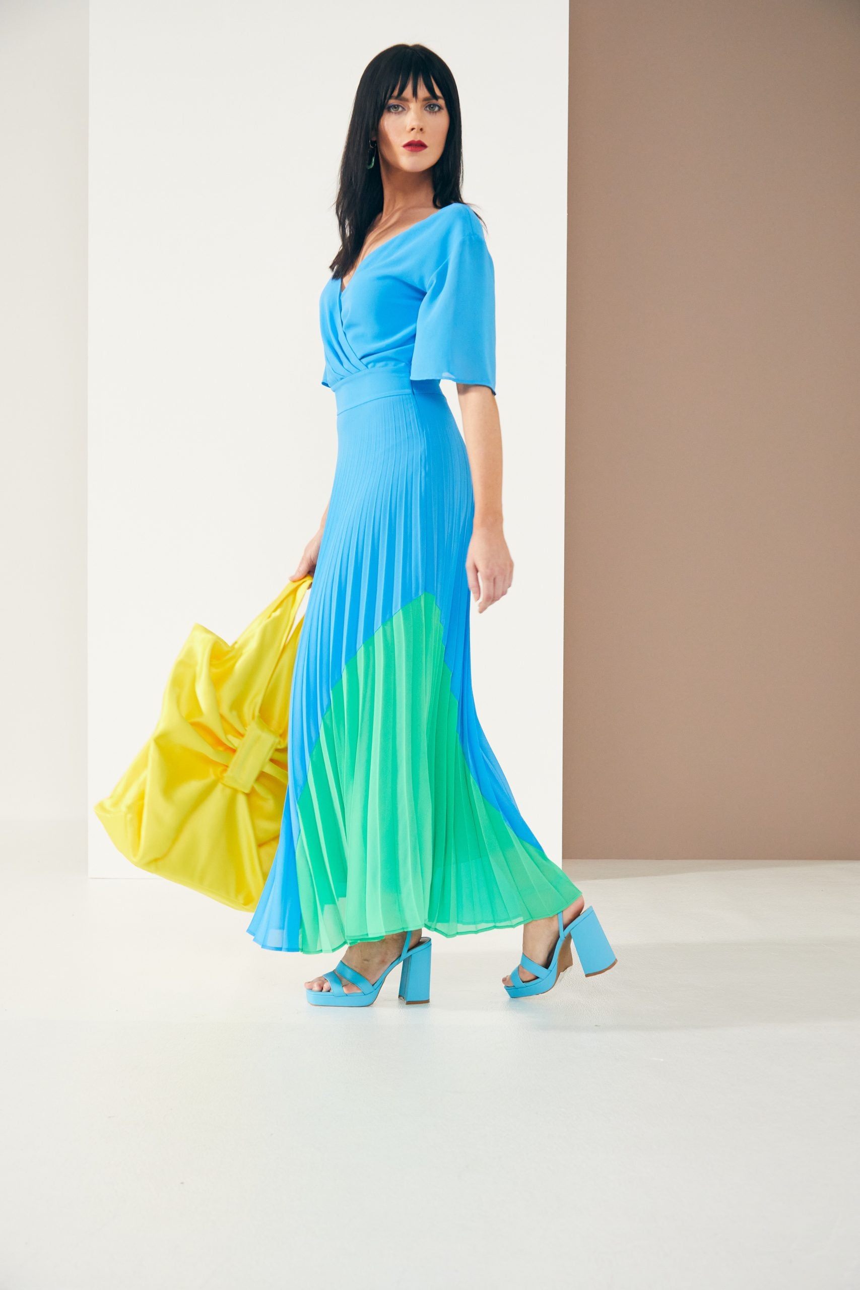 Striking Dress by Kate Cooper . V neckline to back and front and fitted bodice leading to the concertina pleated skirt with contrasting panel.