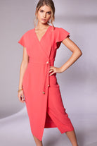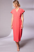 This wrap over style dress by Kate Cooper has a drape fold sleeve and string tie to waistline.
