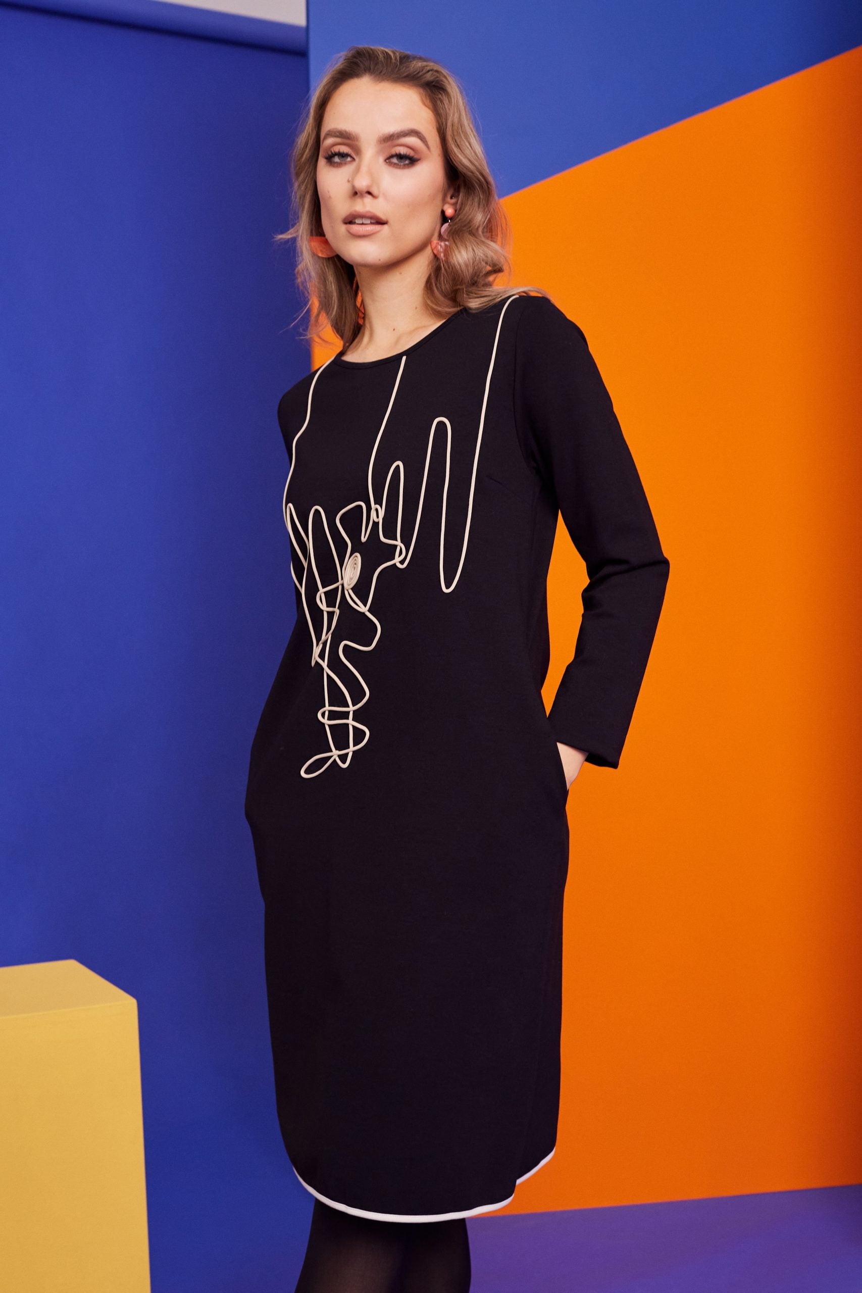 This fully lined dress by Kate Cooper with back zip fastening . long sleeved and layered on ribbon detailed to front panel and hemline