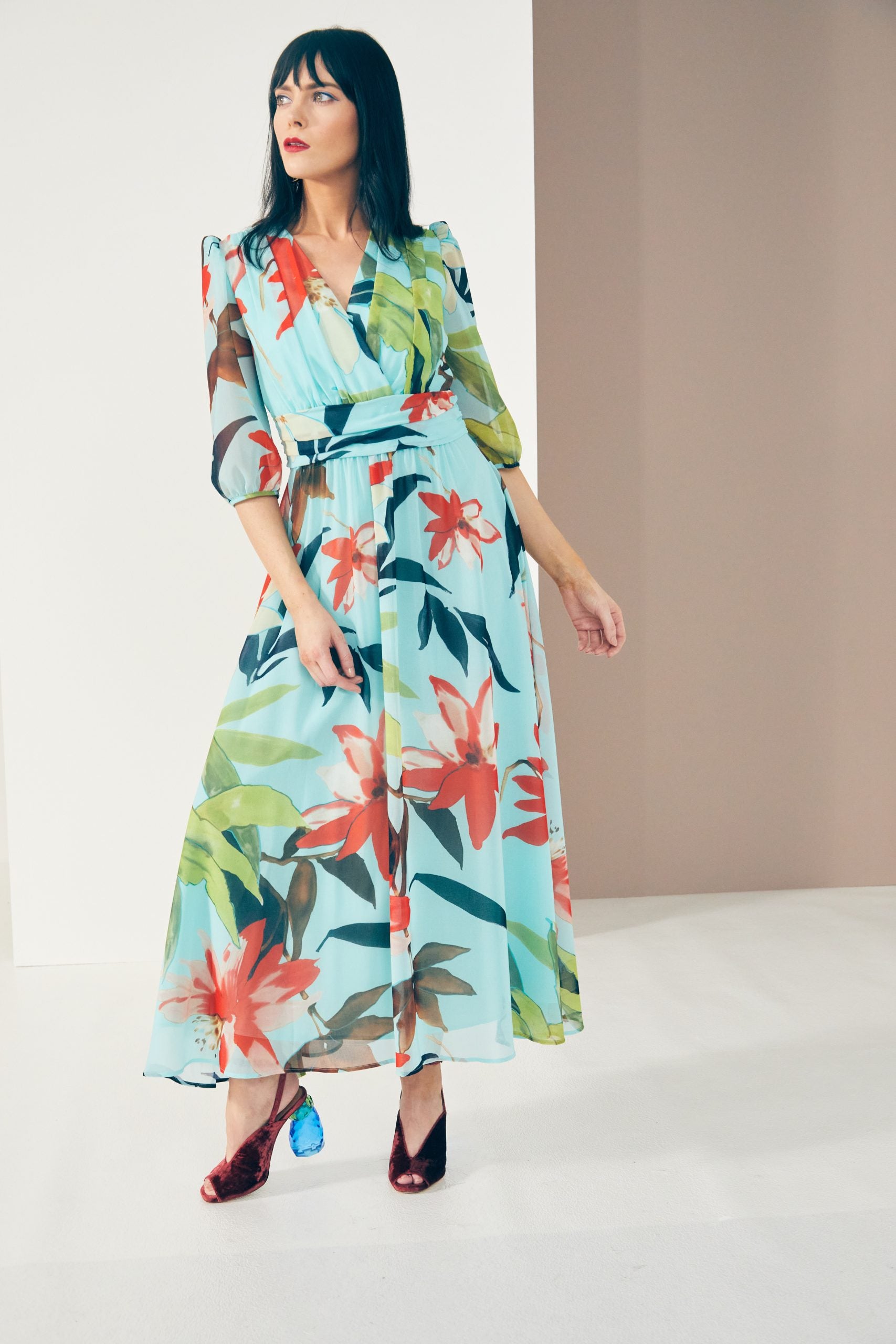 This aqua print dress by Kate Cooper has a crossover bodice with a mock wrap over waistline . 3/4 length sleeves with gathered detail, and a soft swing skirt