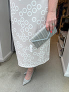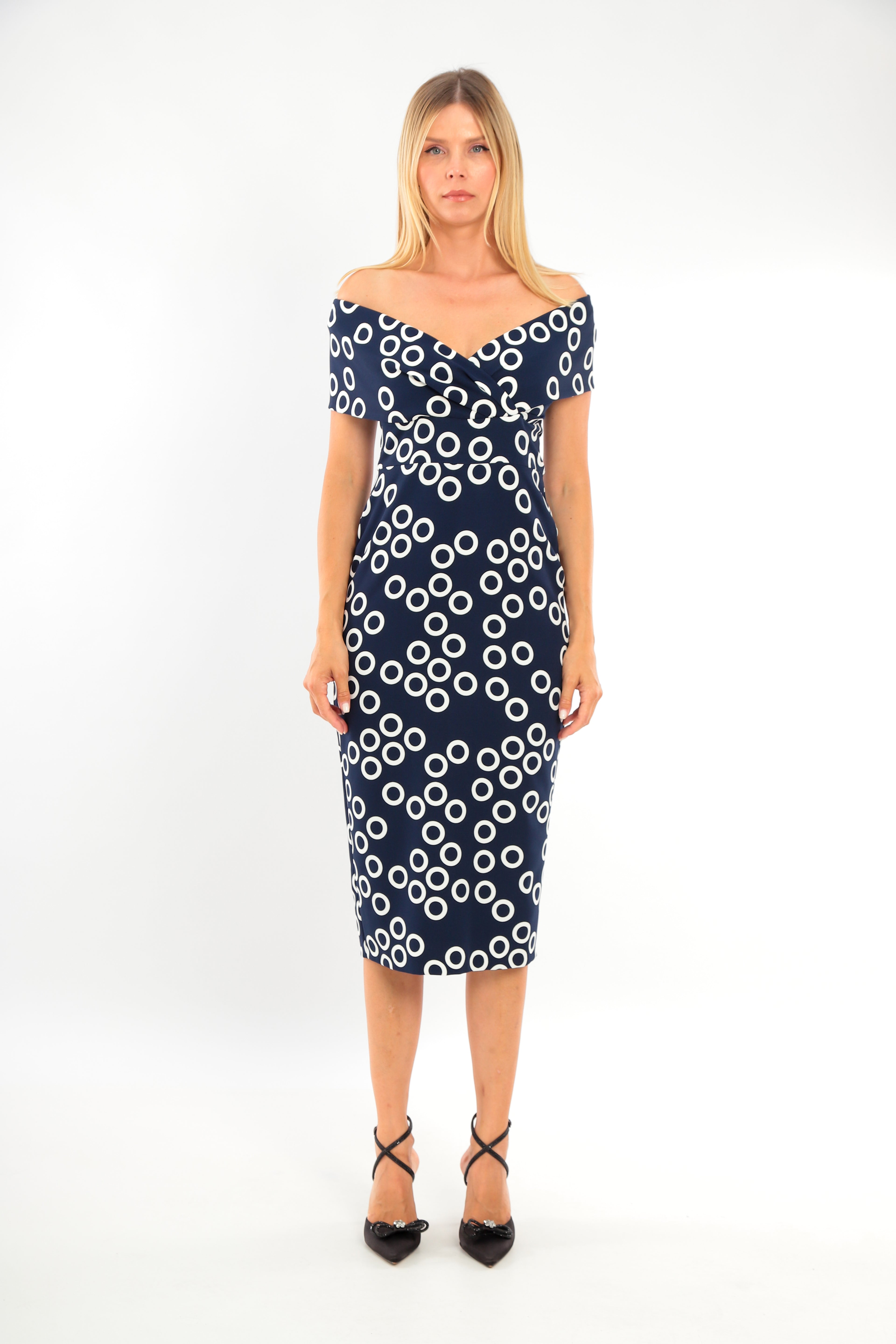This Bardot neckline dress by Lizabella in a circle print has a shawl collar creating the sleeve and a fitted waistline . Straight skirt with back vent. Fully lined and back zip fastening