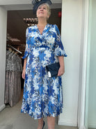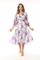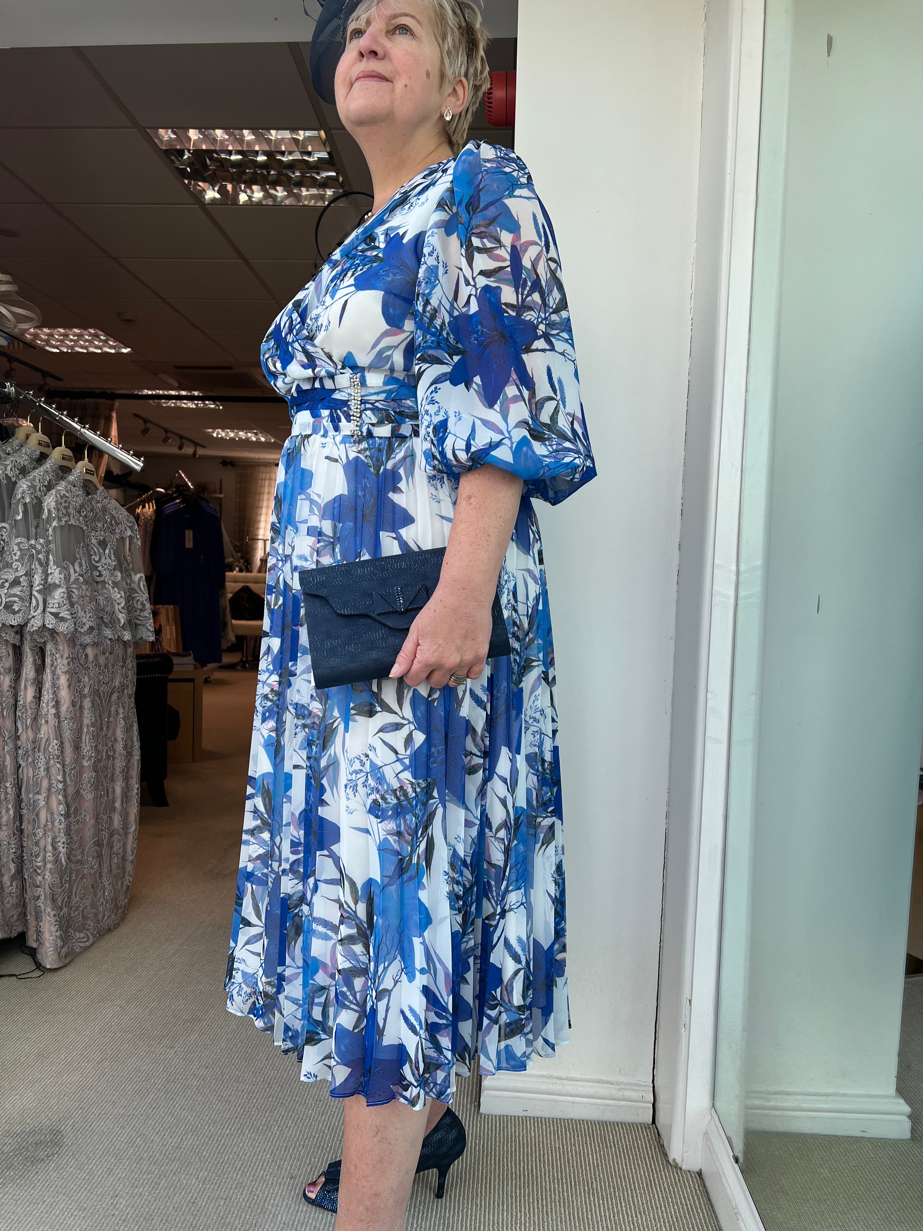 This soft floral print dress by Lizabella has a v neckline and a diamanté detail to waistline . The voile bracelet length sleeves have an elasticated cuff, and the skirt  concertina  pleating. Fully lined and back zip fastening