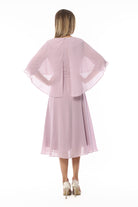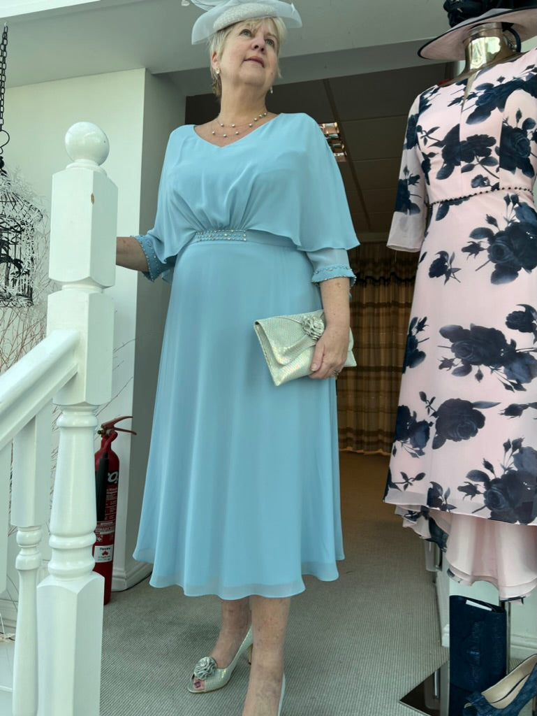 This soft voile dress by Lizabella has a v neckline and bracelet length sleeves with a shear over cape. Embellishment detail to waistline and cuffs. Full swing skirt.