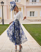 This stunning dress by rosa Clara has a jersey knit bodice with collared crossover neckline, and a triple layered voile printed full skirt.