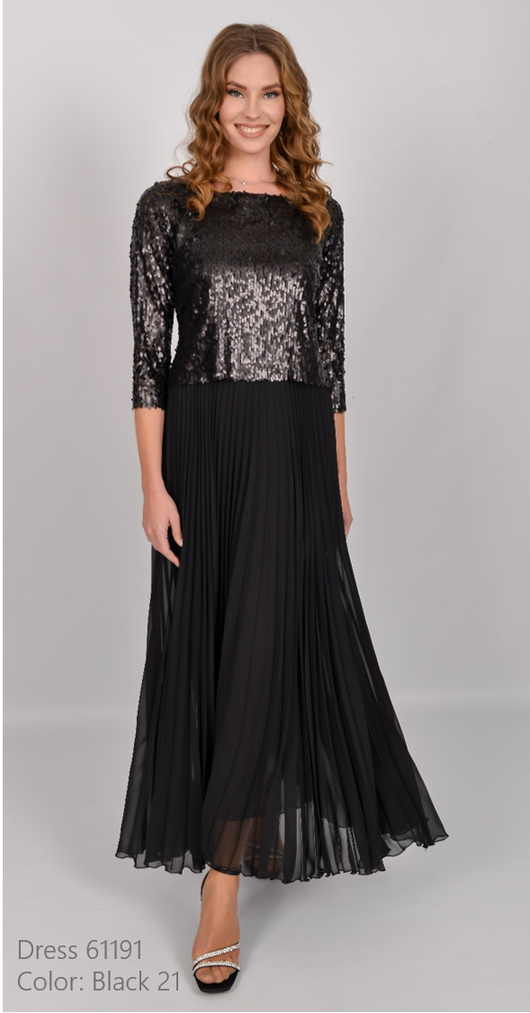 This beautiful dress by Allison has a bracelet length sleeve and round neckline. The sequin detailed bodice with stretch lining is attached to a chiffon concertina pleated skirt.