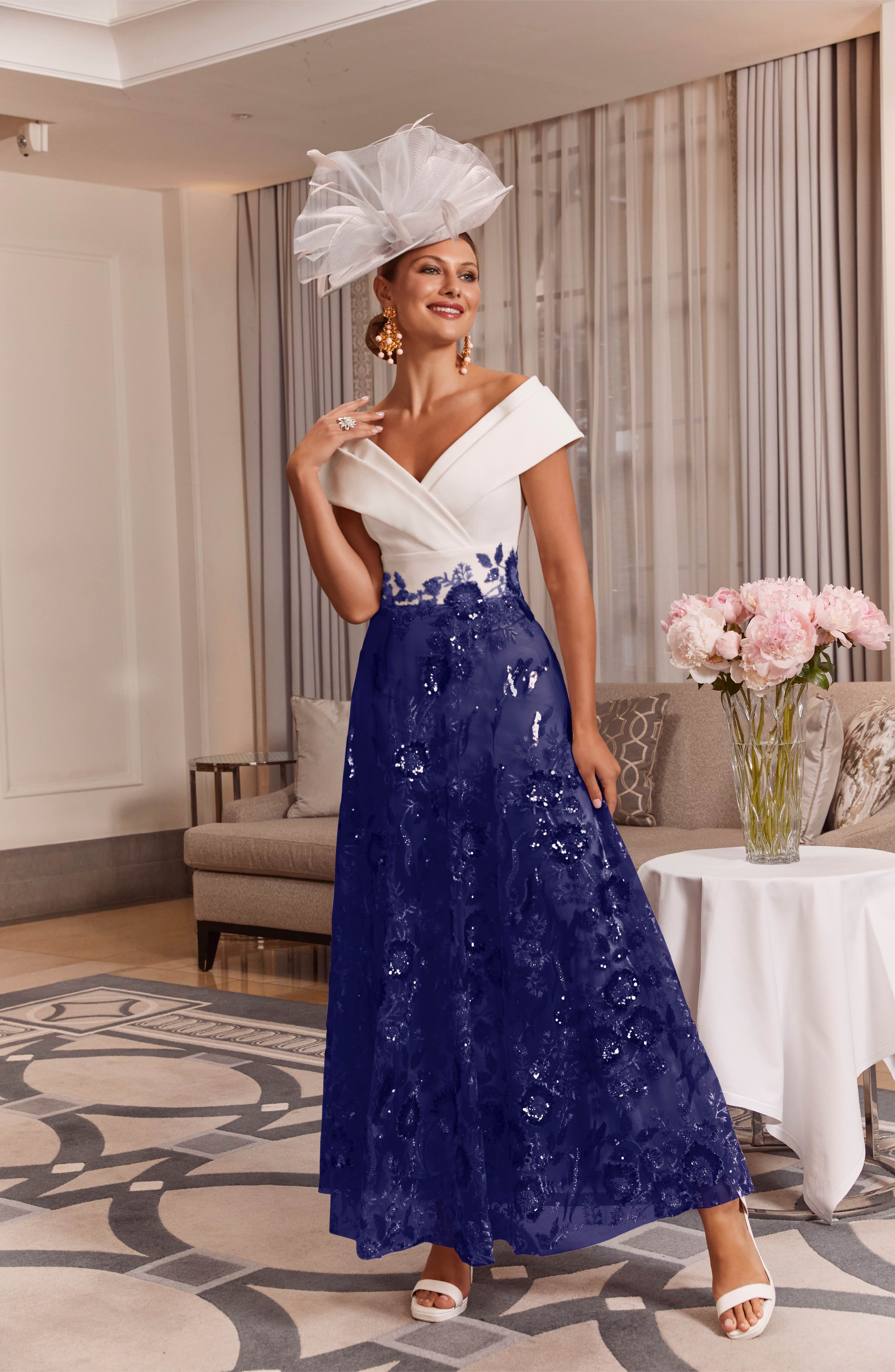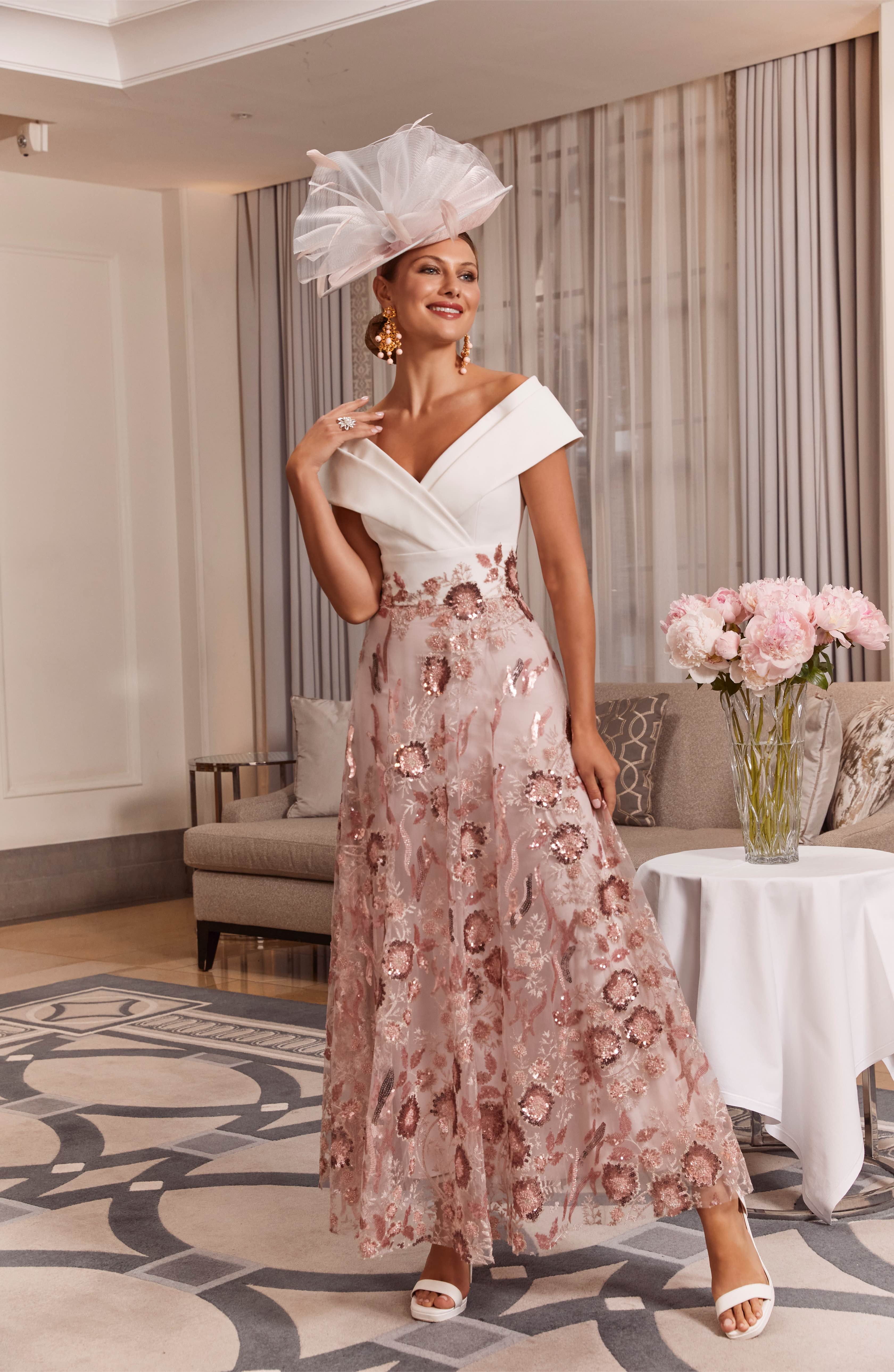 This stunning dress by Veni Infantino has a self coloured bardo neckline with fold detail to the collar. Beautiful embroidered detail to the fitted waistline which continues on to the triple layered skirt.