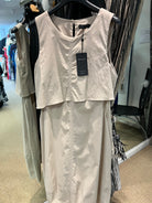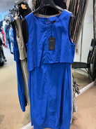 This sleeveless dress with asymmetrical overlay has saddle stitch detail to front panels and side seam pockets.