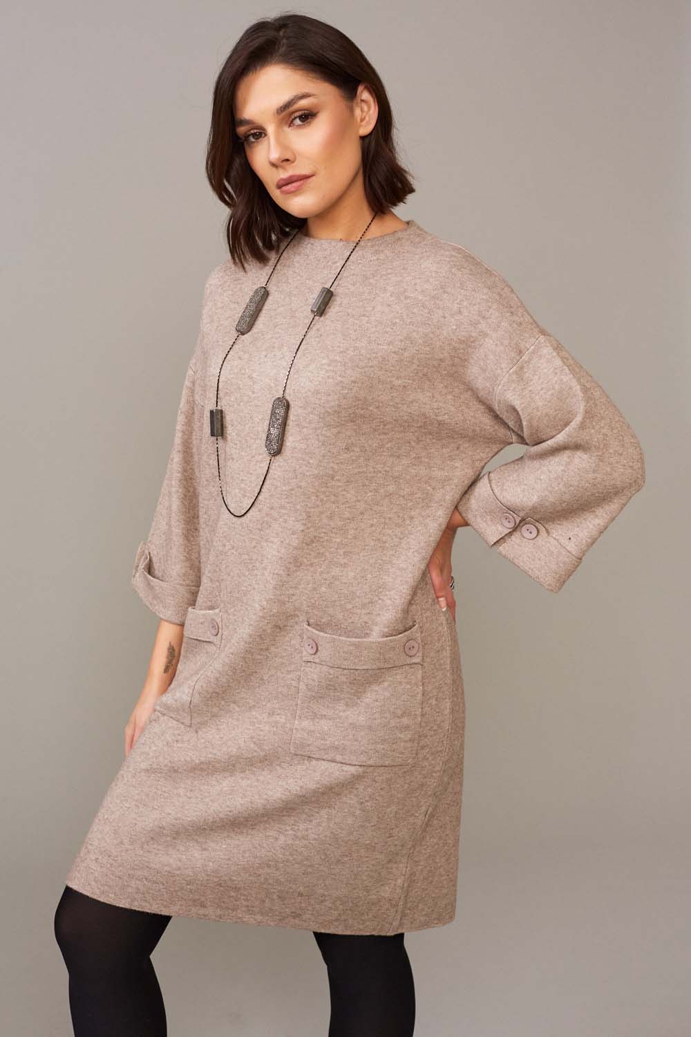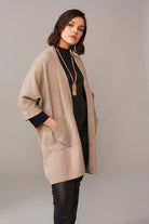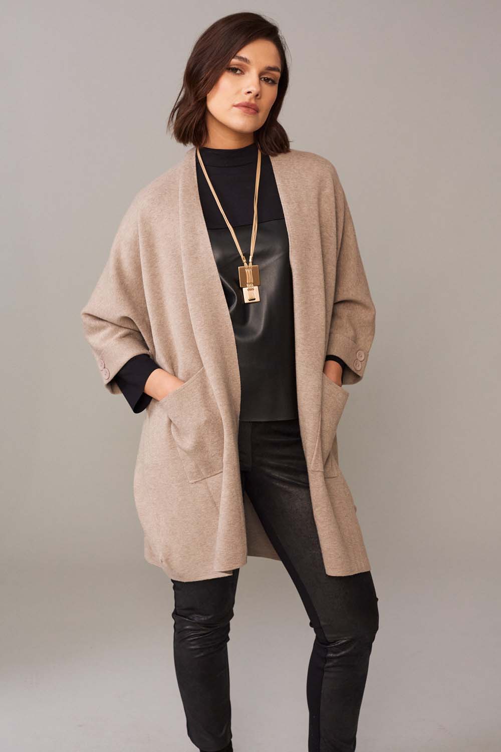 Edge to edge cardigan / jacket with dolman sleeves , button detail to cuff. Large patch pockets to front.