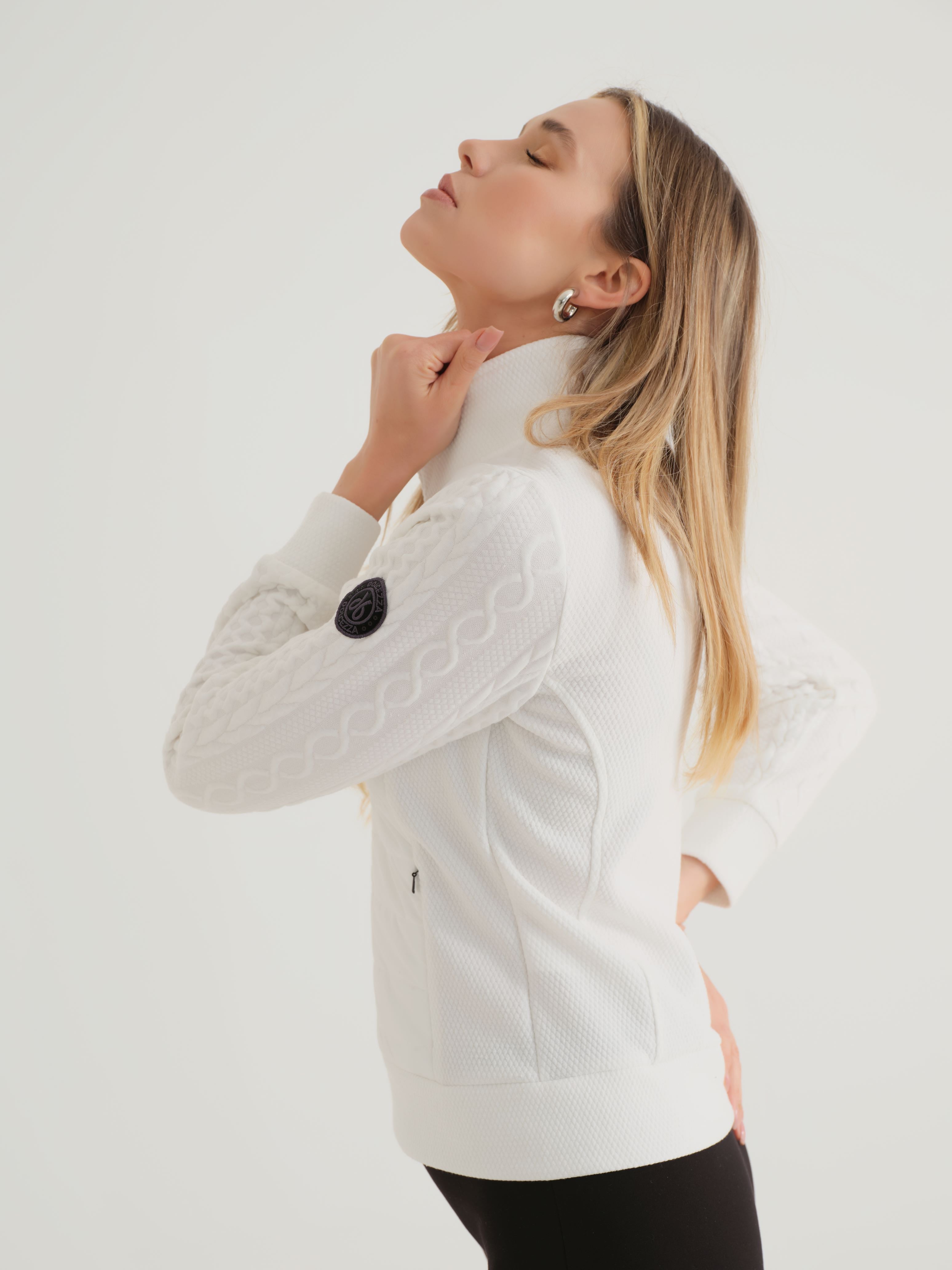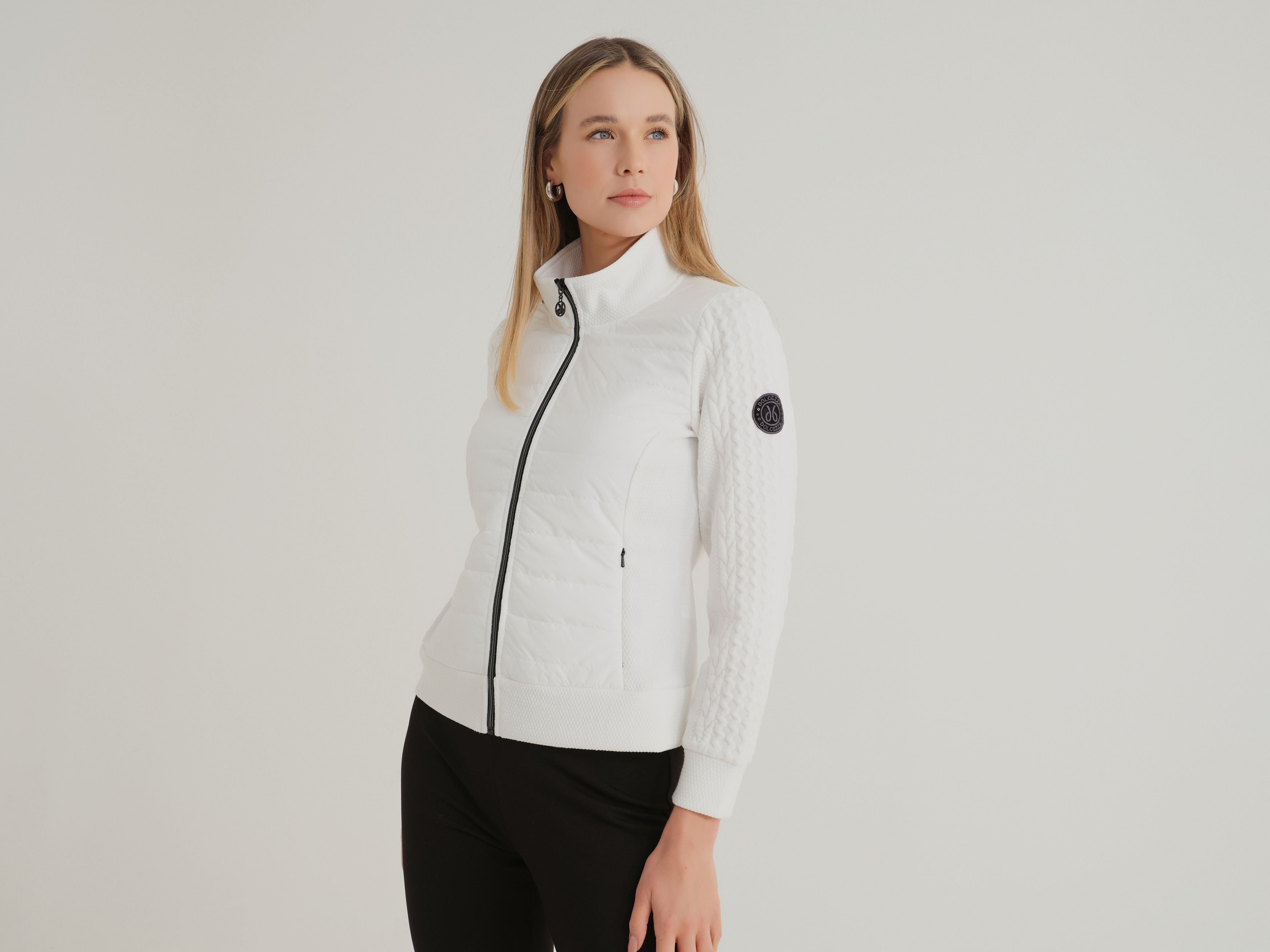 This casual / smart jacket by Dolcezza has a quilted bodice and cable knit sleeves.