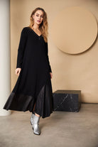 This semi fitted dress by Naya has a v neckline and long sleeves. the asymmetrical hemline has contrasting leather look panels