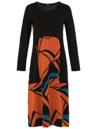 This abstract print dress by Sassy has a self coloured flattering bodice and inset with the print panels to the skirt and back