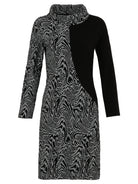 This woven knit dress by Sassy has a roll collared neckline and a self coloured inset which defines the waist