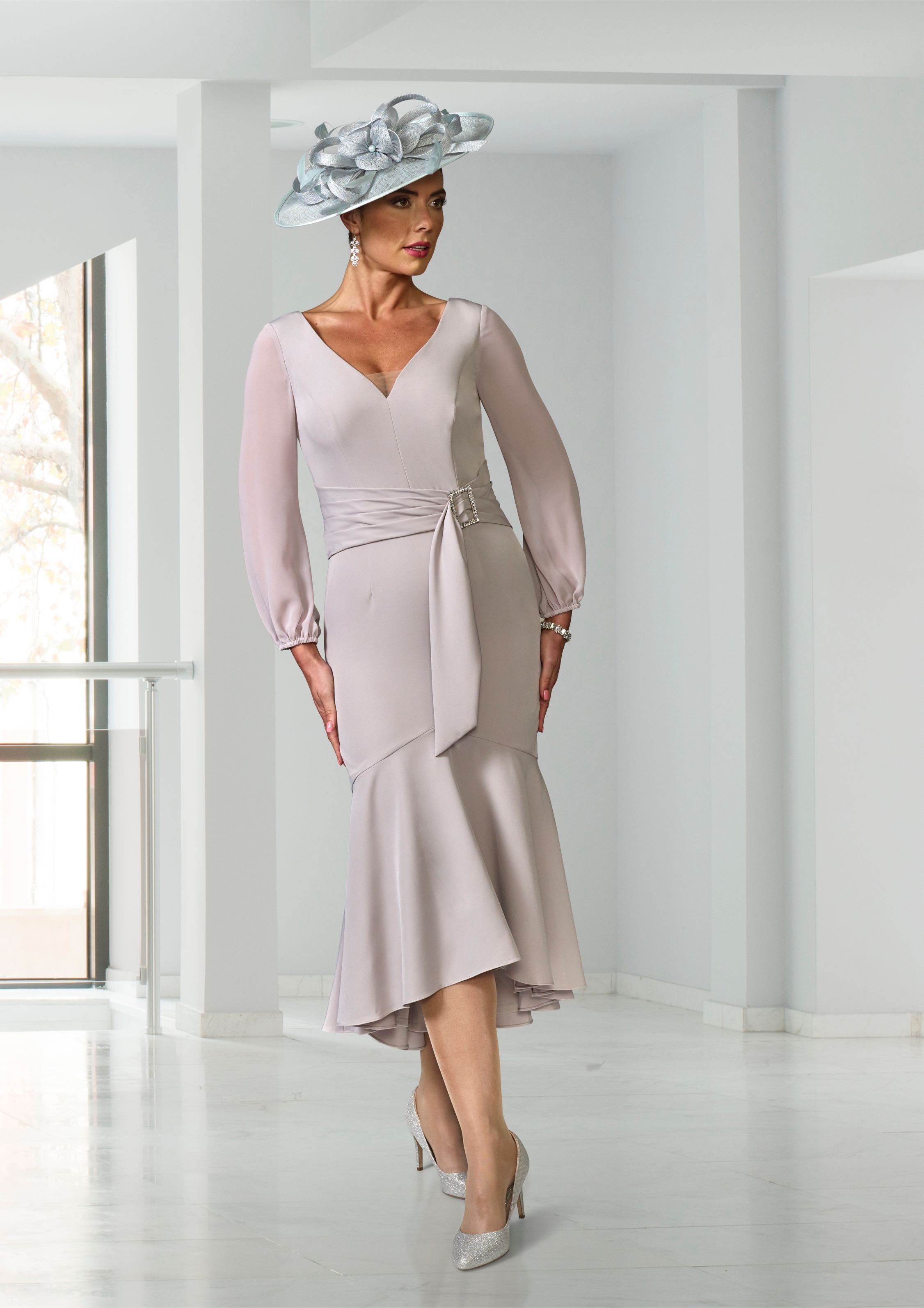 This beautiful dress by Veromia has a v neckline with mesh modesty panel and voile sleeves. The fitted bodice with waistline diamanté trimmed sash belt leads to a hemline swing skirt with fishtail hemline.