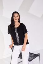 This open mesh top by Naya with round neckline and drop sleeve has a print  design to front panel. With self coloured  black vest top