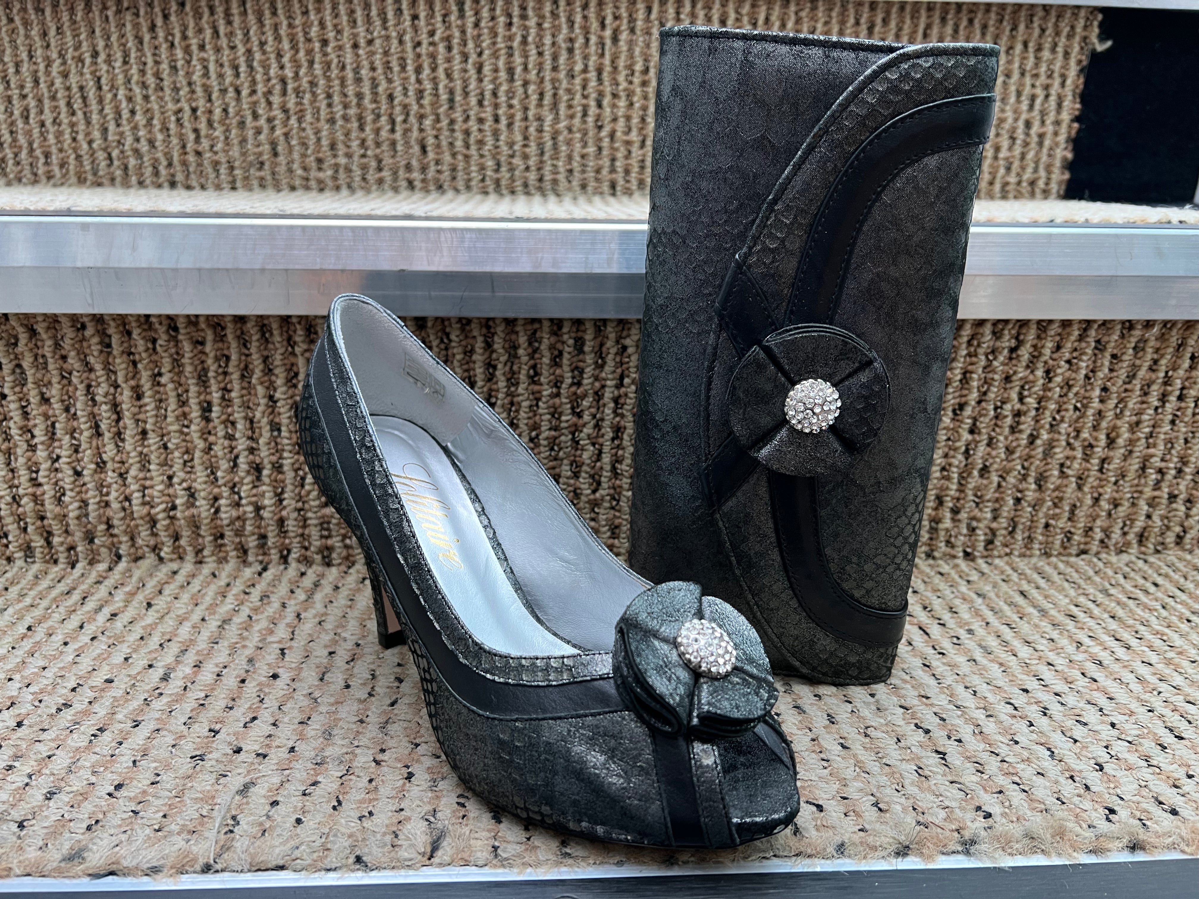 Two tone leather shoe by Solitaire . Peeped toed with a diamanté detailed shoe trim.