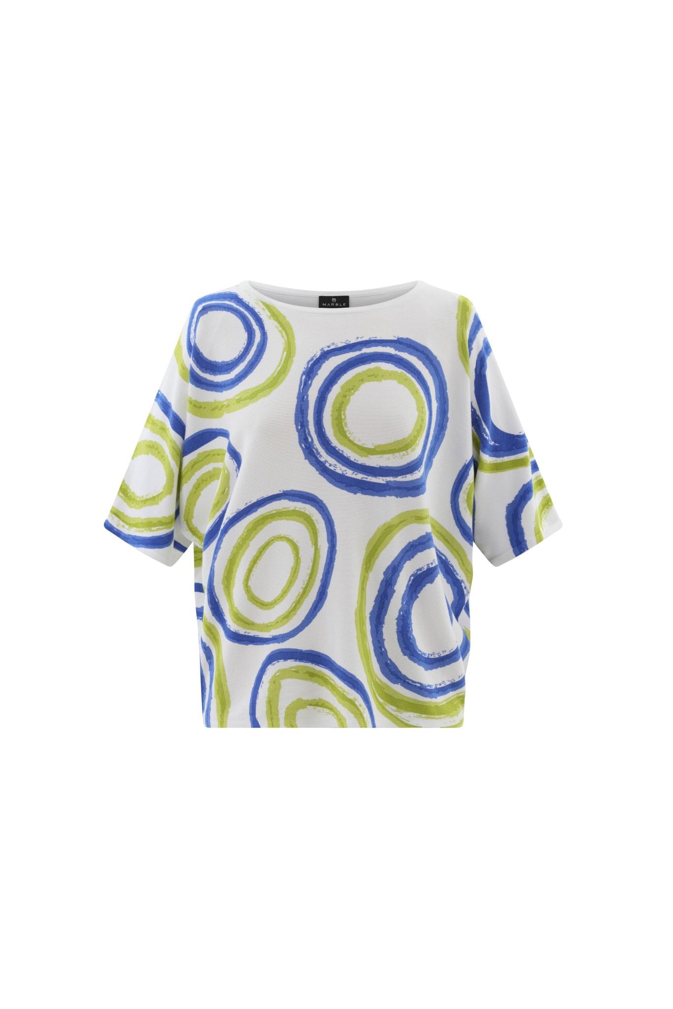 This oversized knit with circular design has a round neckline and 3/4 sleeves