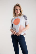 This 2 piece viscose slub top has a relaxed fit circle print design with a shaped hemline and a self coloured vest worn under