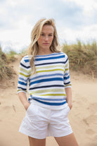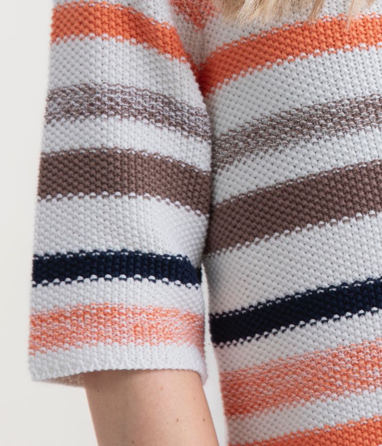 This cotton mix sweater by Marble has a boat neckline 3/4 sleeves and is a relaxed fitting