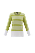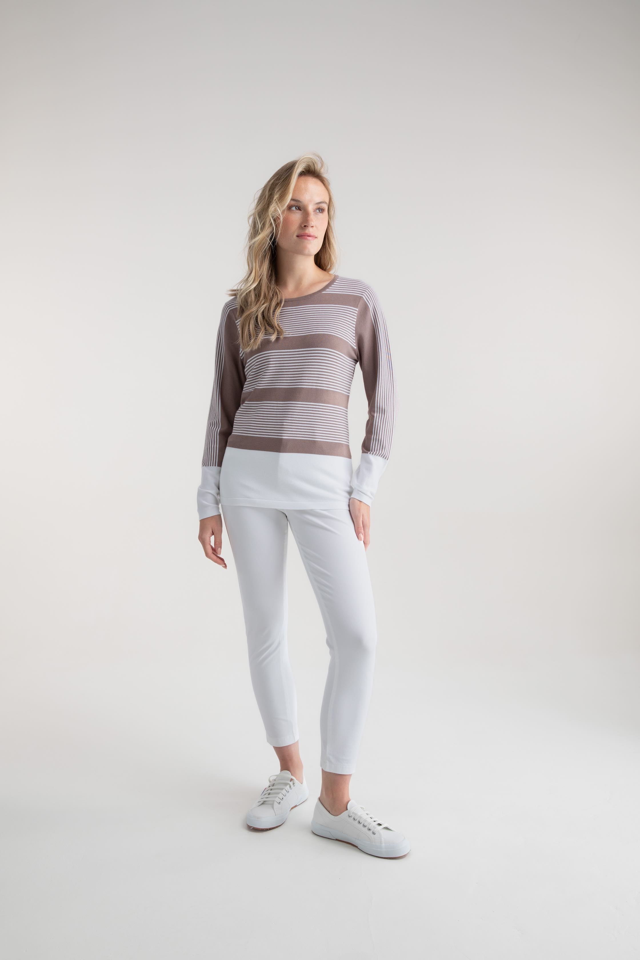 This sweater by Marble in contrast stripe has a round neckline and self coloured welt and cuffs