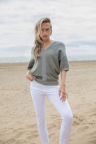 This v neck sweater by Marble in a twisted yarn has a centre front and back knit detail