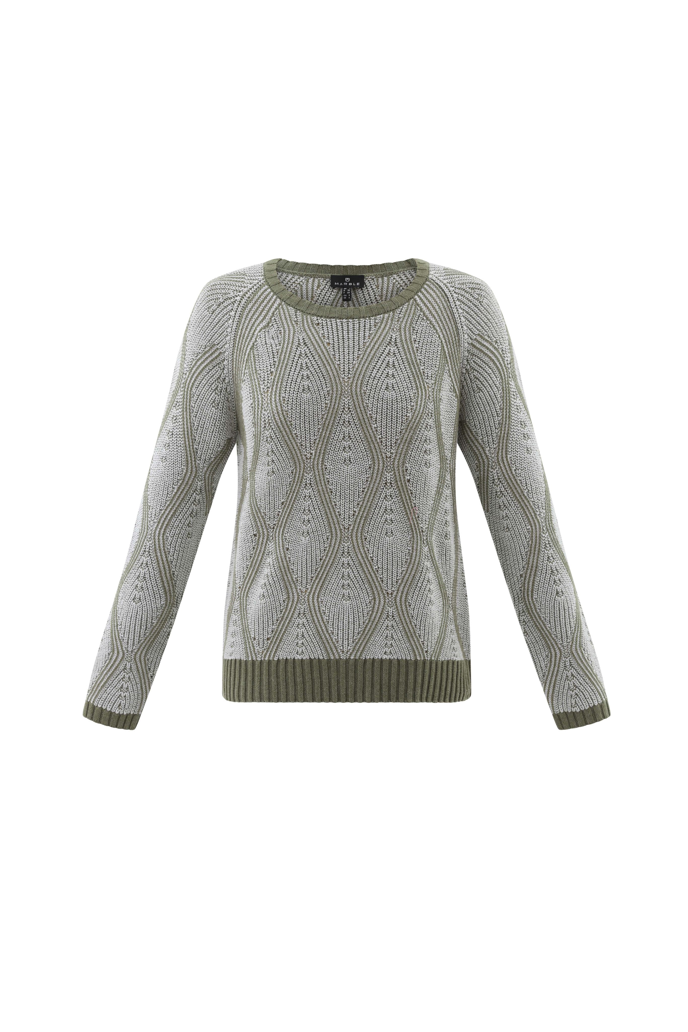 This crew neck sweater by Marble has a raglan sleeve setting . Two tone twisted knit design with a self coloured welt and cuffs
