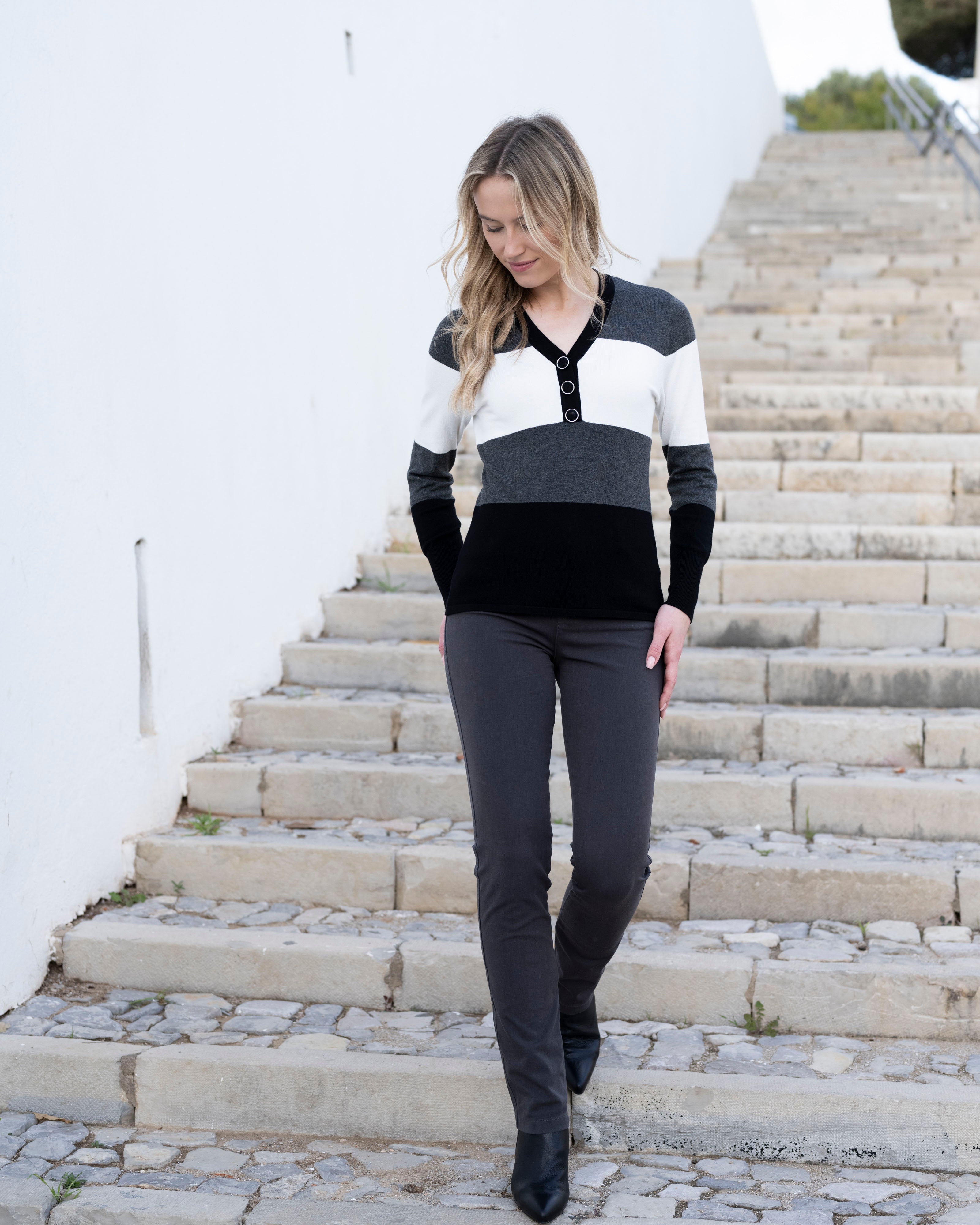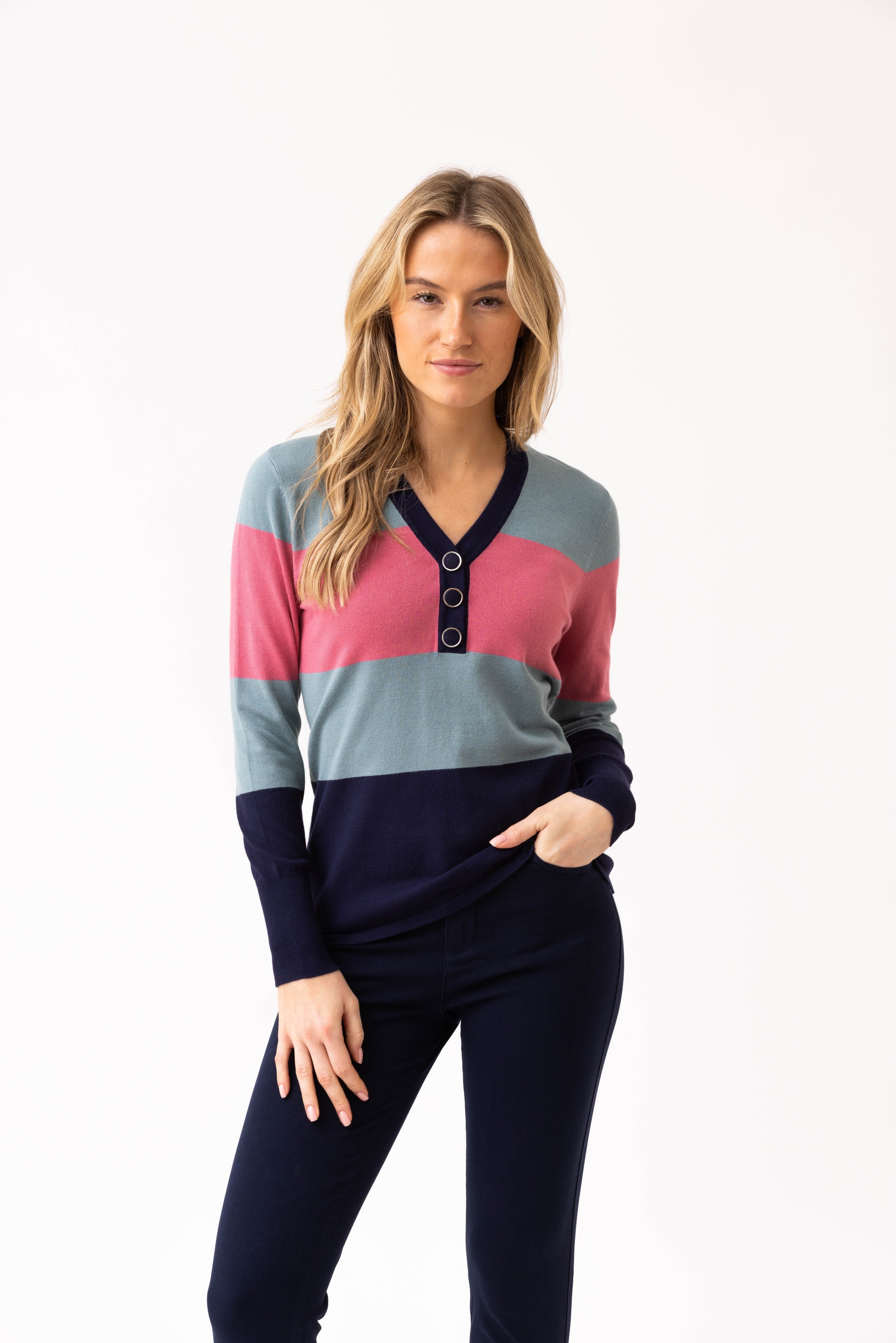 This tri colour way sweater by Marble is a classic fitting with button detail to neckline