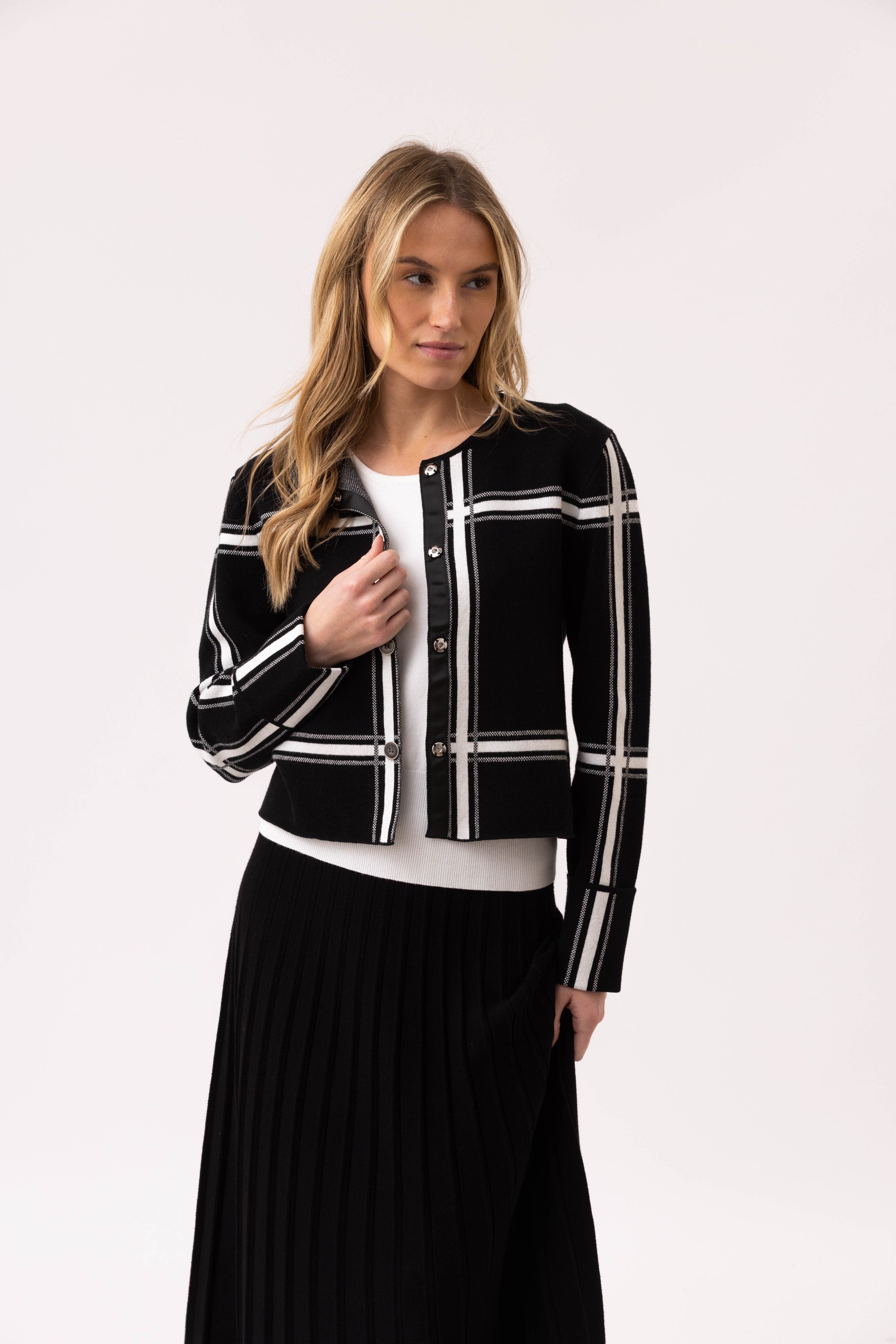 This jacquard check knitted jacket with contrasting stripe detail is a relaxed fitting with a button through fastening